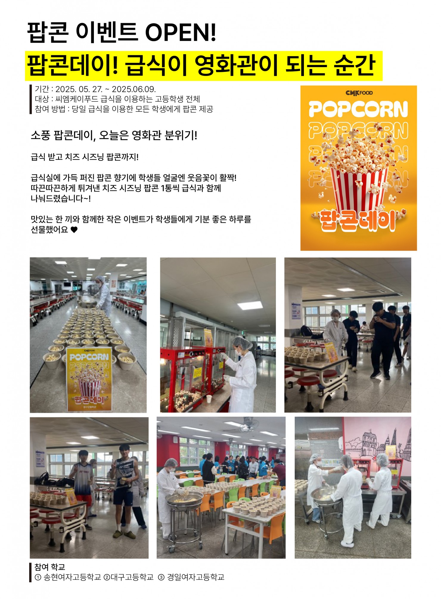 씨엠케이푸드 급식을 이용하는 학생들을 대상으로 '팝콘데이' 이벤트를 진행했습니다.
