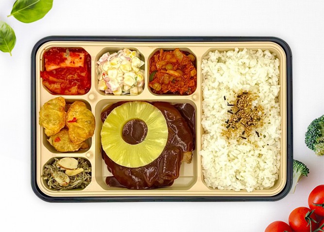 메뉴구성: 백미밥, 후리가케, 파인함박&소스, 5가지 반찬기본구성: 도시락, 국, 수저세트